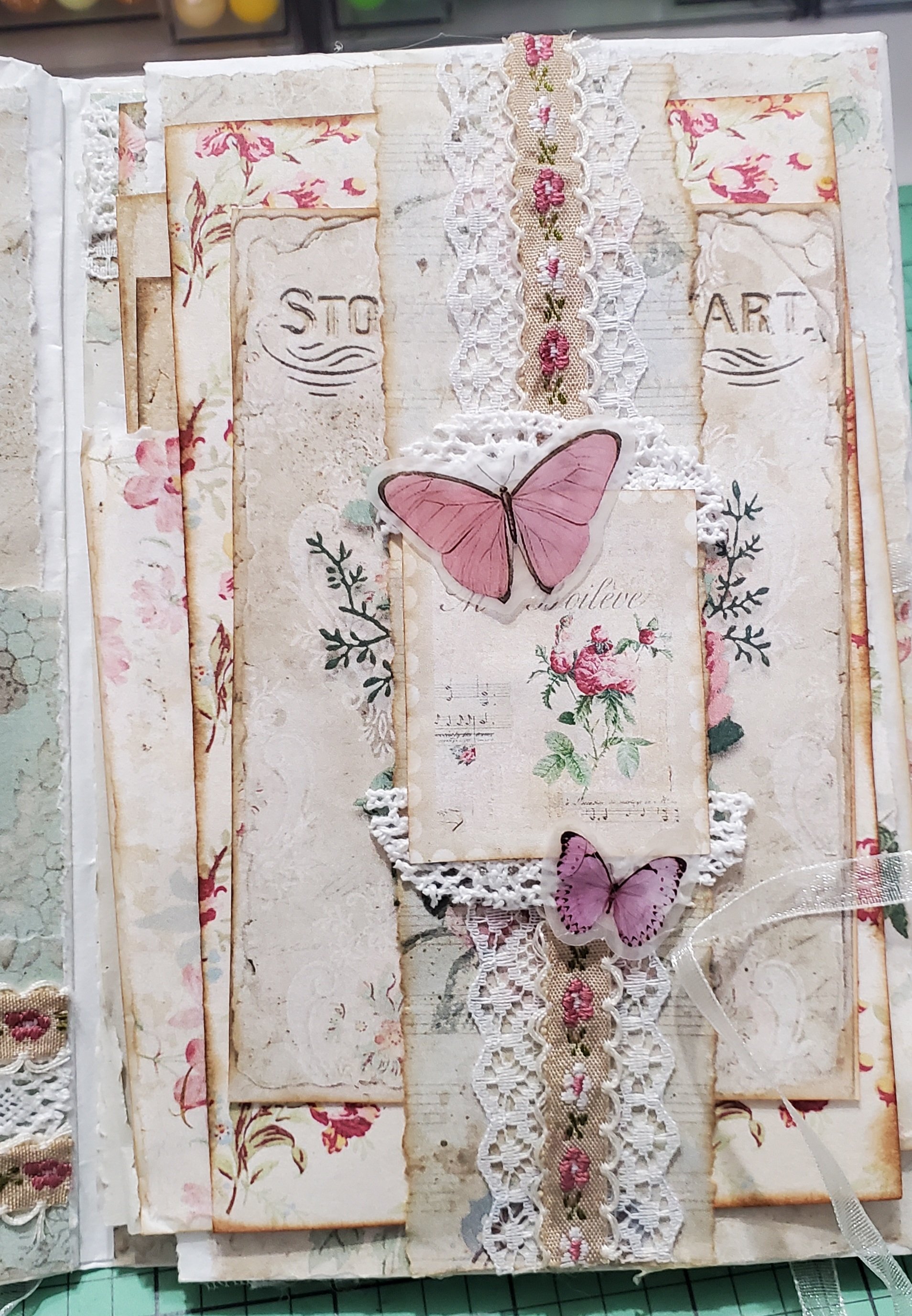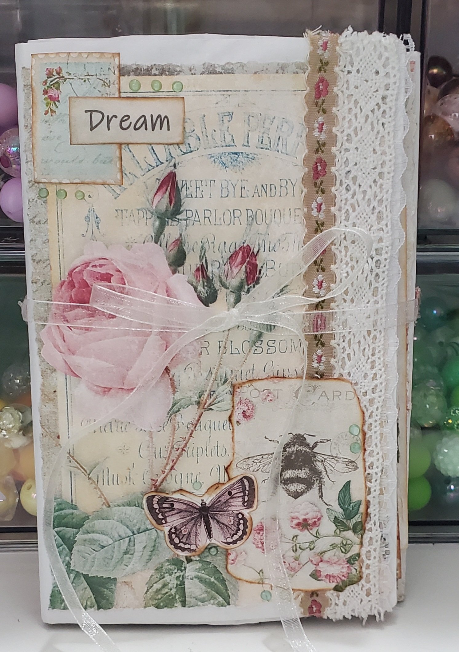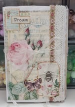 Adorable handmade shabby folio. Perfect for recording some special memories. Perfect size to throw in your bag on the go. Measures about 7x4.5" Please see photos for more detail.